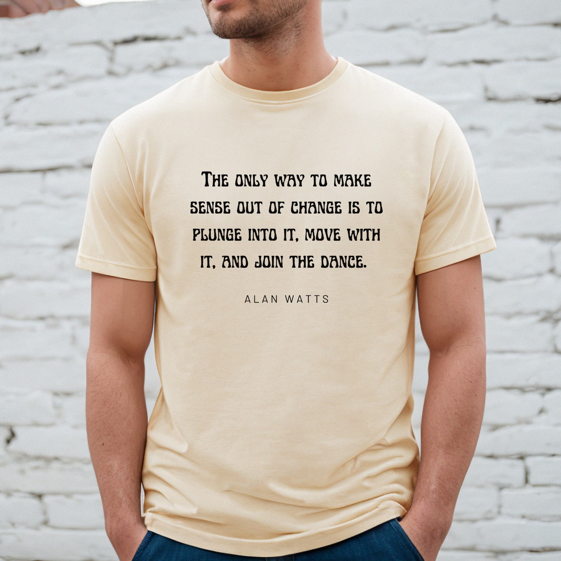 Embrace the flow of life with our Alan Watts quote t-shirt. Featuring the inspiring words, “The only way to make sense out of change is to plunge into it, move with it, and join the dance,” this tee is perfect for free spirits who live life with openness and curiosity.