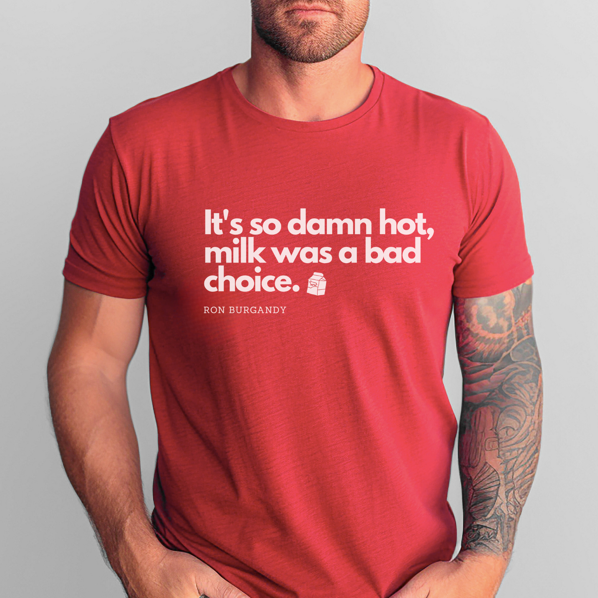 This T-Shirt features a quote from the Anchorman movie delivered by Ron Burgundy, played by Will Ferrell. The humorous quote 'It's so damn hot, milk was a bad choice' adds a fun and quirky vibe to your wardrobe. Perfect for fans of the movie or anyone who enjoys a good laugh. Ideal for casual wear and movie-themed events.