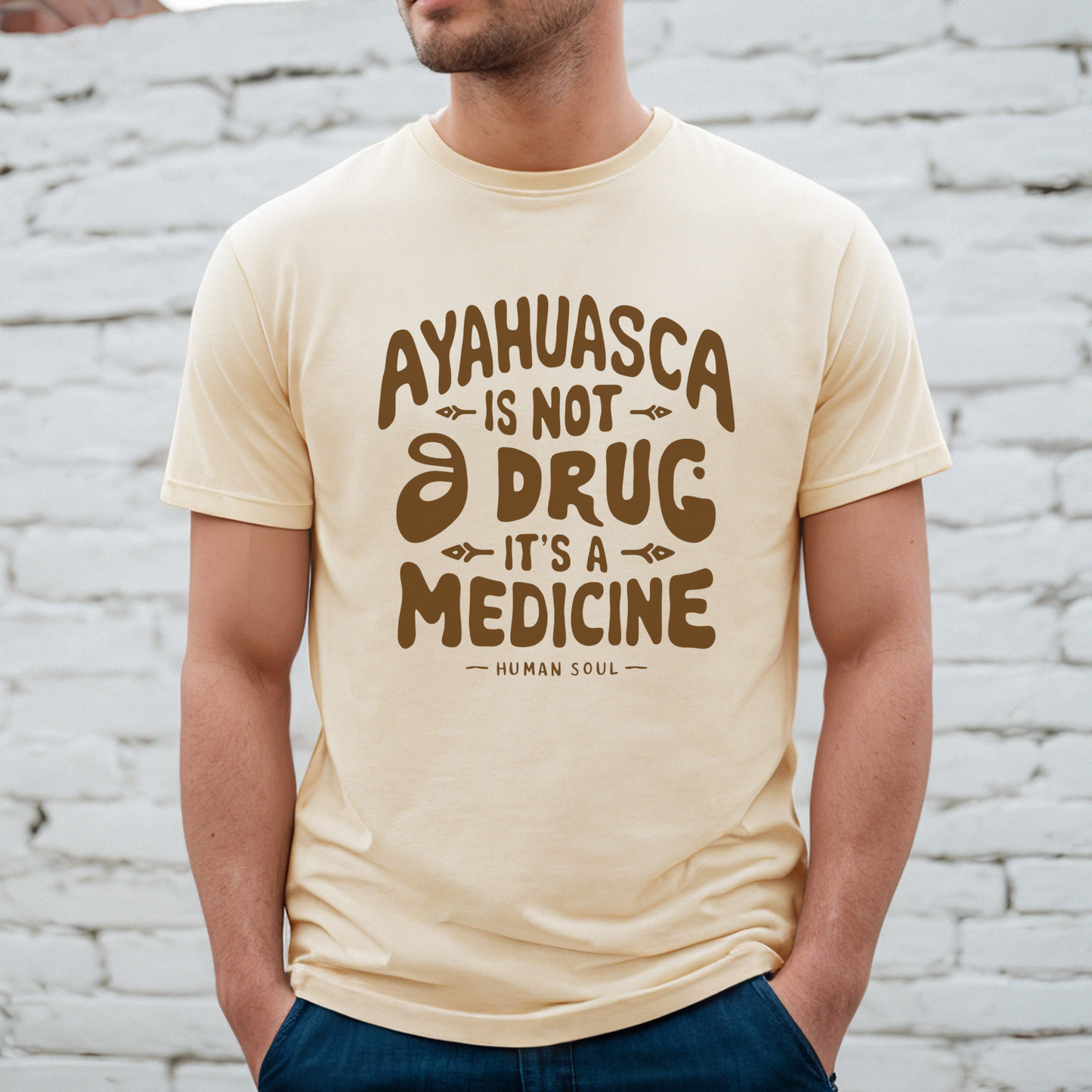 An artistic brown boho text T-Shirt with a plant medicine quote, 'ayahuasca is not a drug it's a medicine'. Perfect for those who appreciate plant medicine and spirituality. Ideal for casual wear, layering, or accessorizing in both active and leisure settings. Relevant for spiritual gatherings, festivals, yoga classes, and meditation sessions.
