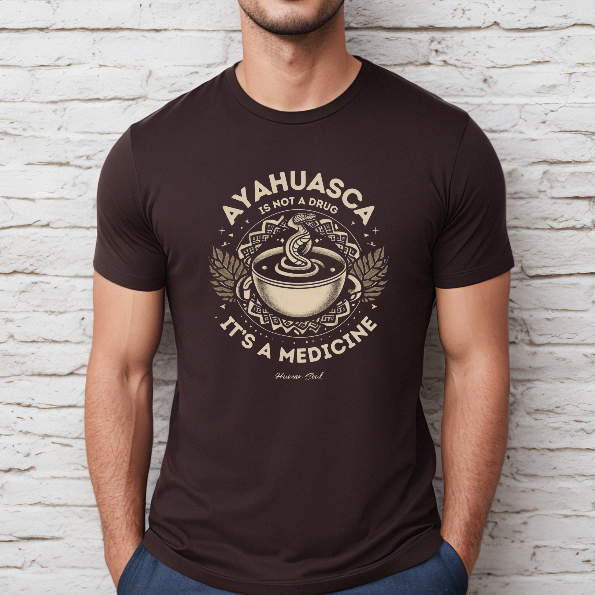 Embrace the healing journey with our 'Ayahuasca is not a drug, it's a medicine' t-shirt. Featuring a cup of ayahuasca with a snake rising, this tee honors the sacred plant medicine.