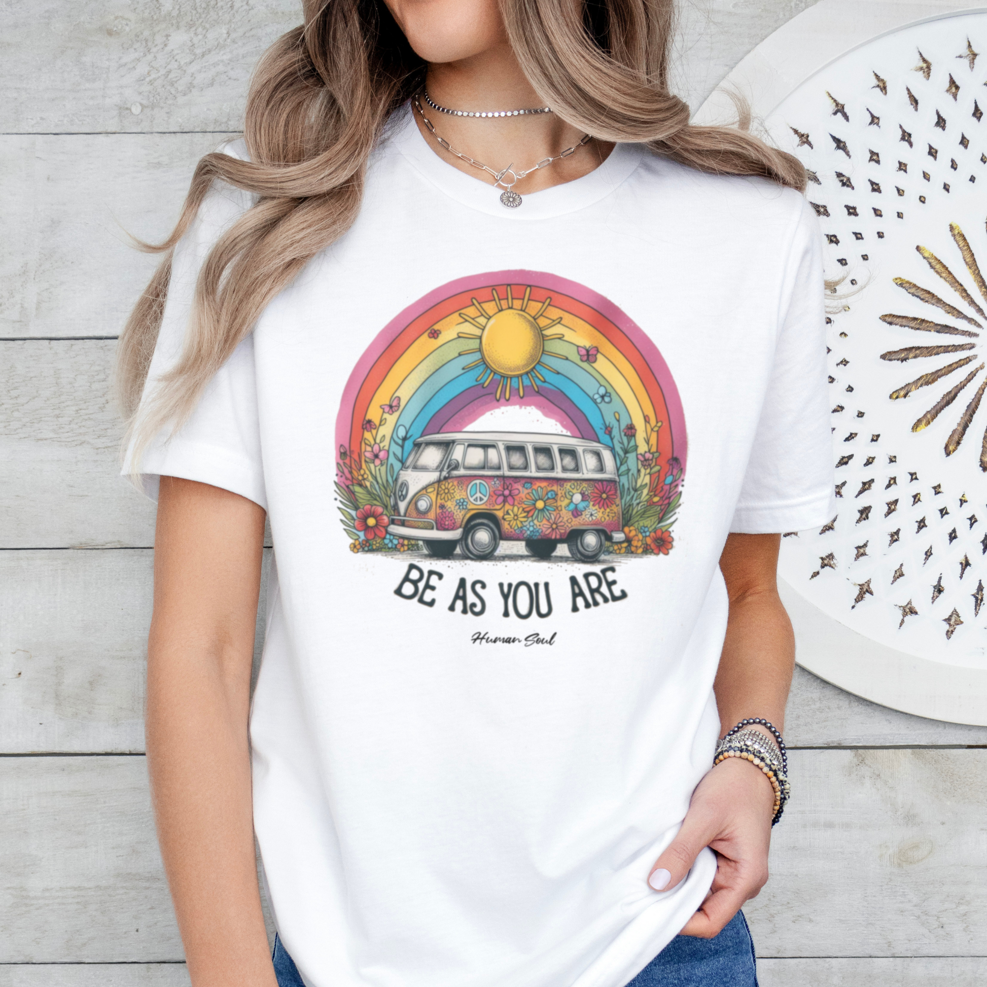 A colorful and vibrant Women's Tee featuring the words 'Be As You Are' with a rainbow and caravan design. This tee exudes positivity and inclusivity, perfect for those who embrace their true selves. Ideal for everyday wear, pride celebrations, music festivals, and casual outings.