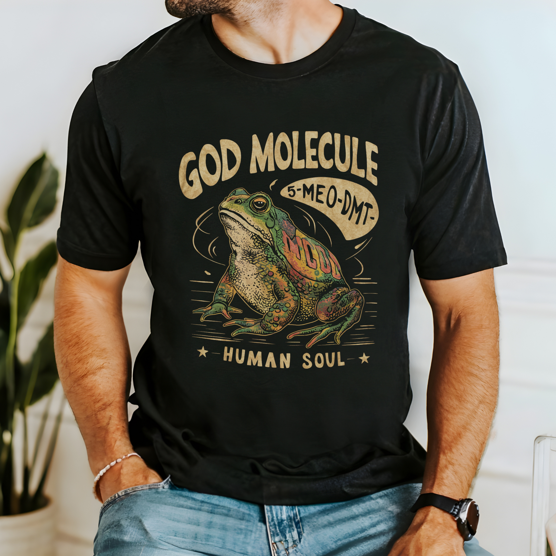 Embrace awakening with our psychedelic T-Shirt featuring the words 'God Molecule 5 Meo DMT' with an image of a toad. This unique design gives off a spiritual and mind-expanding vibe, perfect for those interested in psychedelics and spirituality. Ideal for casual wear and can be layered for various occasions.