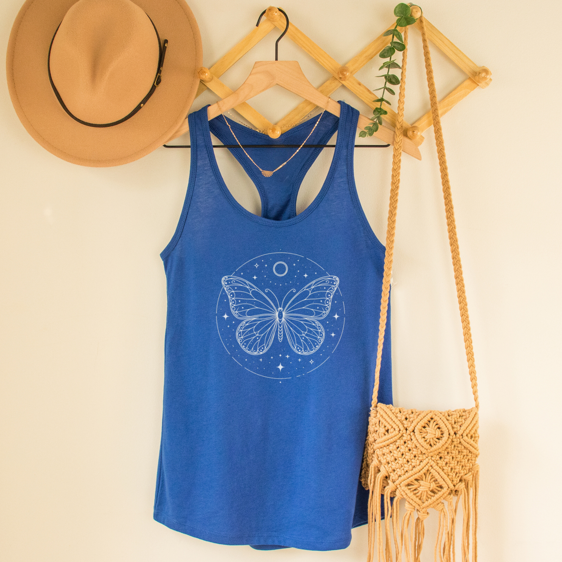 Embrace the etheral grace of the night sky with our "Celestial Butterfly" racerback tank top. Perfect for yoga, a music festival, a casual day out, or a quiet evening under the stars. Best worn tied in a knot and paired with a long boho skirt, or with leggings