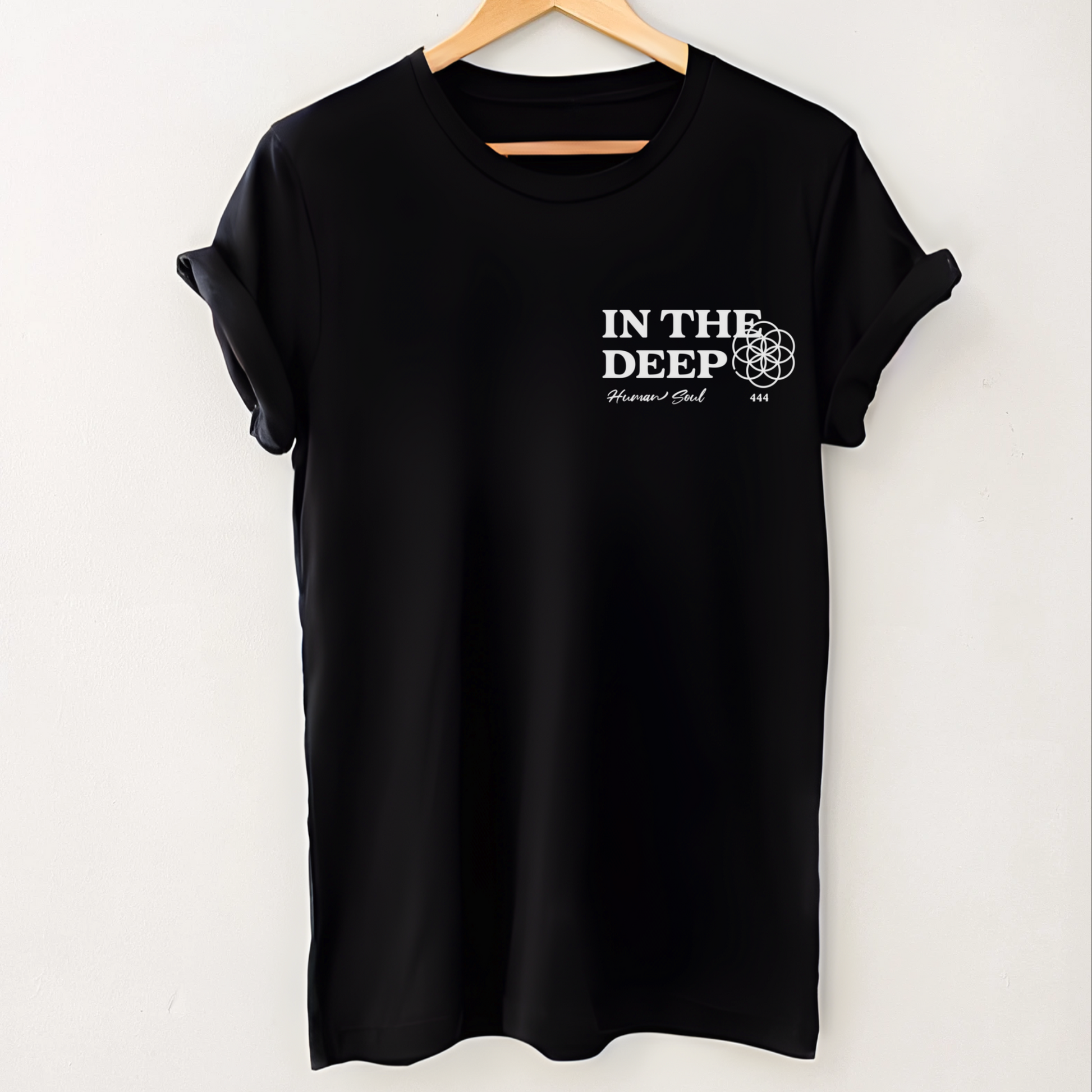 Explore dimensions with our 'In the Deep' Sacred Geometry Seed of Life 444 pocket printed t-shirt. Featuring sacred geometry and the angel numbers 444, this tee is perfect for those who connect with deeper spiritual aspects and spiritual guidance.