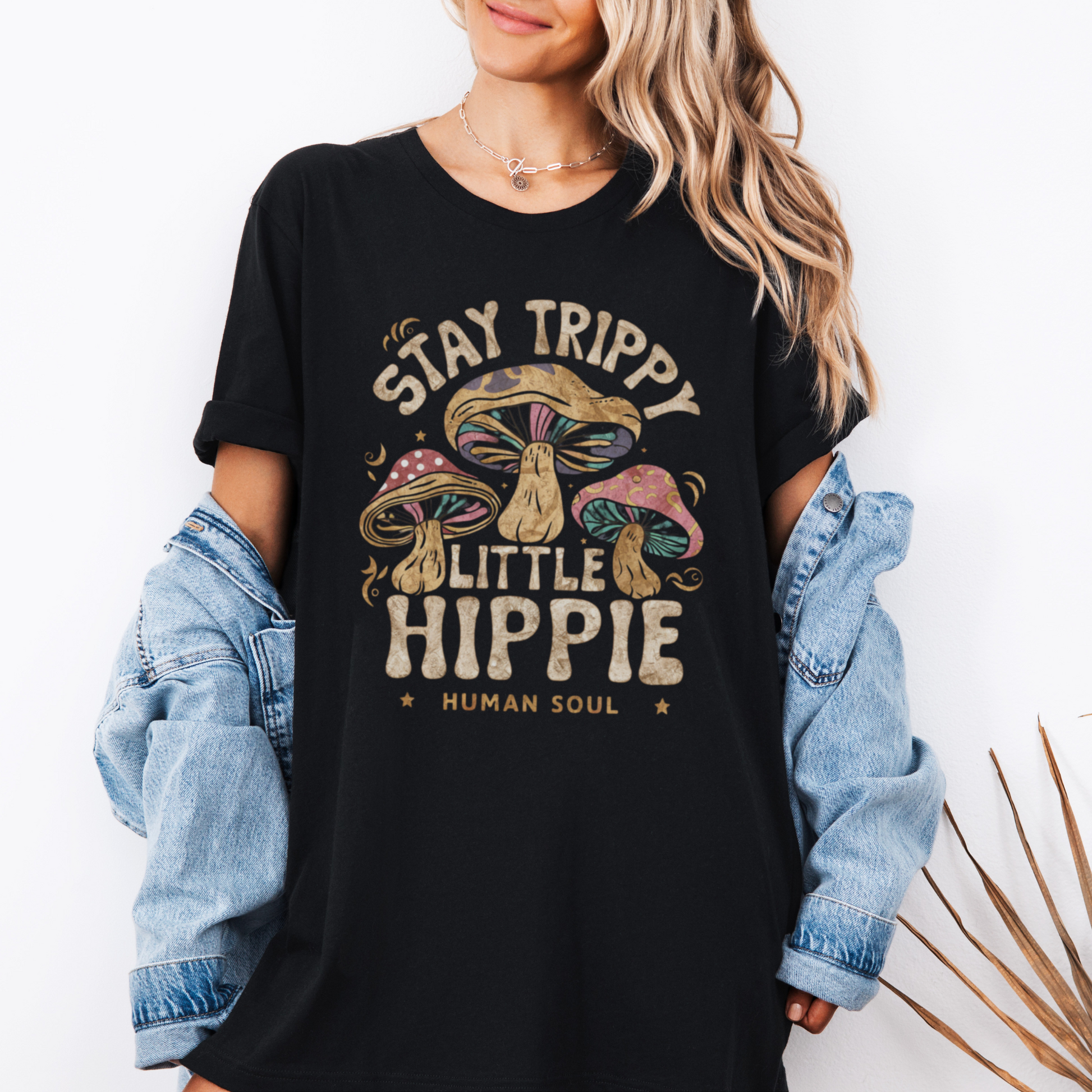 Stay groovy with our 'Stay Trippy Little Hippie' magic mushroom t-shirt, featuring magic mushrooms and a stylish retro design that’s all about good vibes.♥️