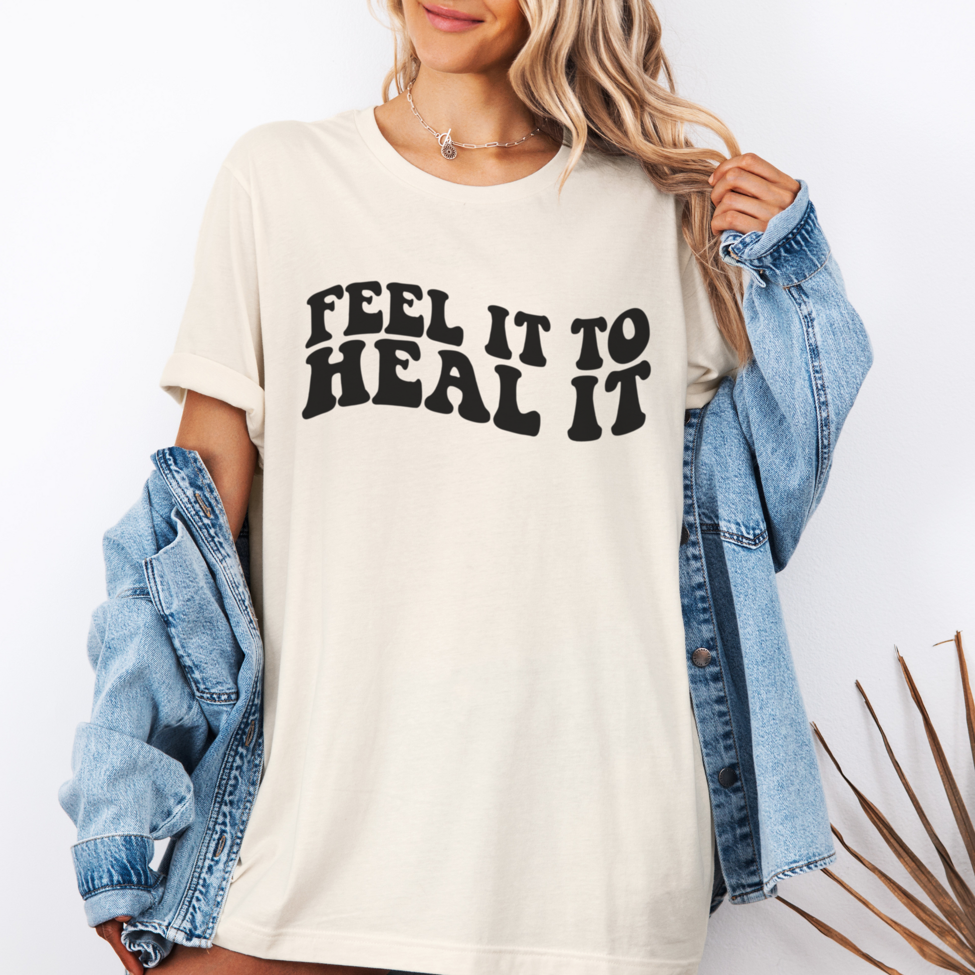 Embrace the journey with our "Feel It to Heal It" t-shirt. Featuring black wavy retro text, this tee encourages you to lean into your emotions and trust the healing process. Perfect for those who believe in self-growth and inner peace.