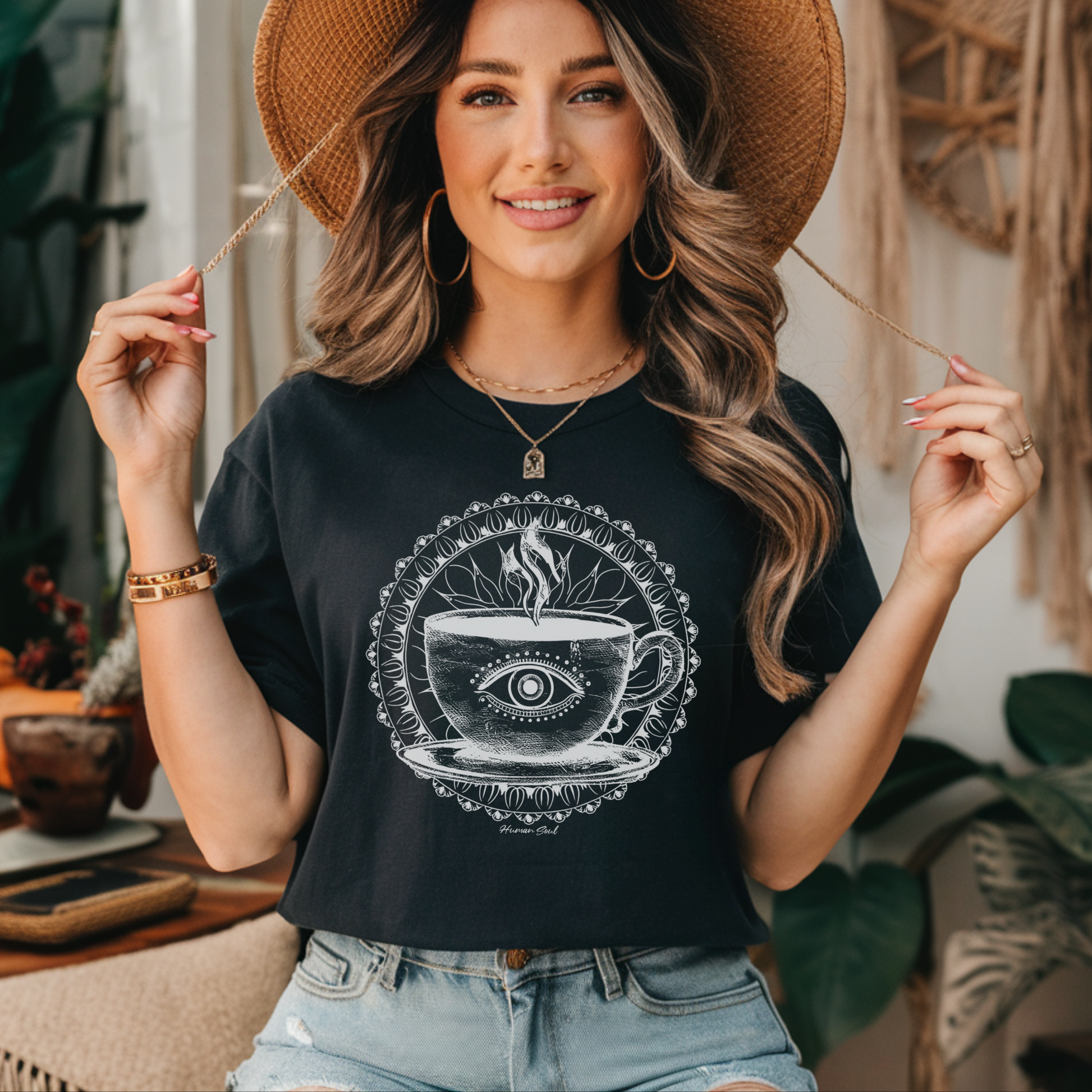 Celebrate your love for psychedelic teas with our 'Psychedelic Teacup' boho mandala t-shirt. Featuring a third eye tea cup design, this tee is perfect for those who appreciate the spiritual journey and want to share their mystical vibe.
