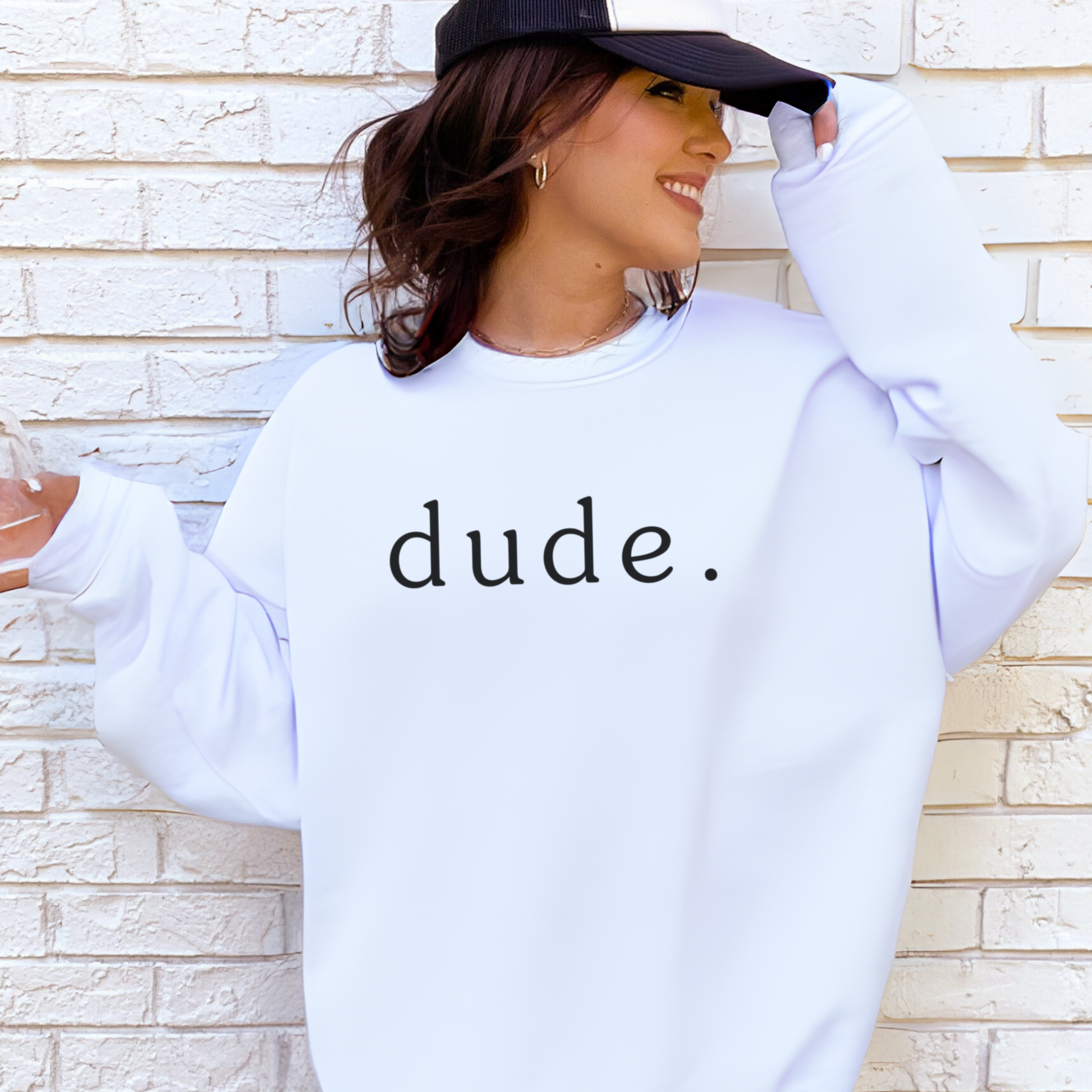 Keep it laid-back and effortlessly cool with our "Dude" minimal sweatshirt. Featuring minimal black text, this piece is all about embracing that chill vibe with a touch of simplicity. Perfect for those easygoing days.