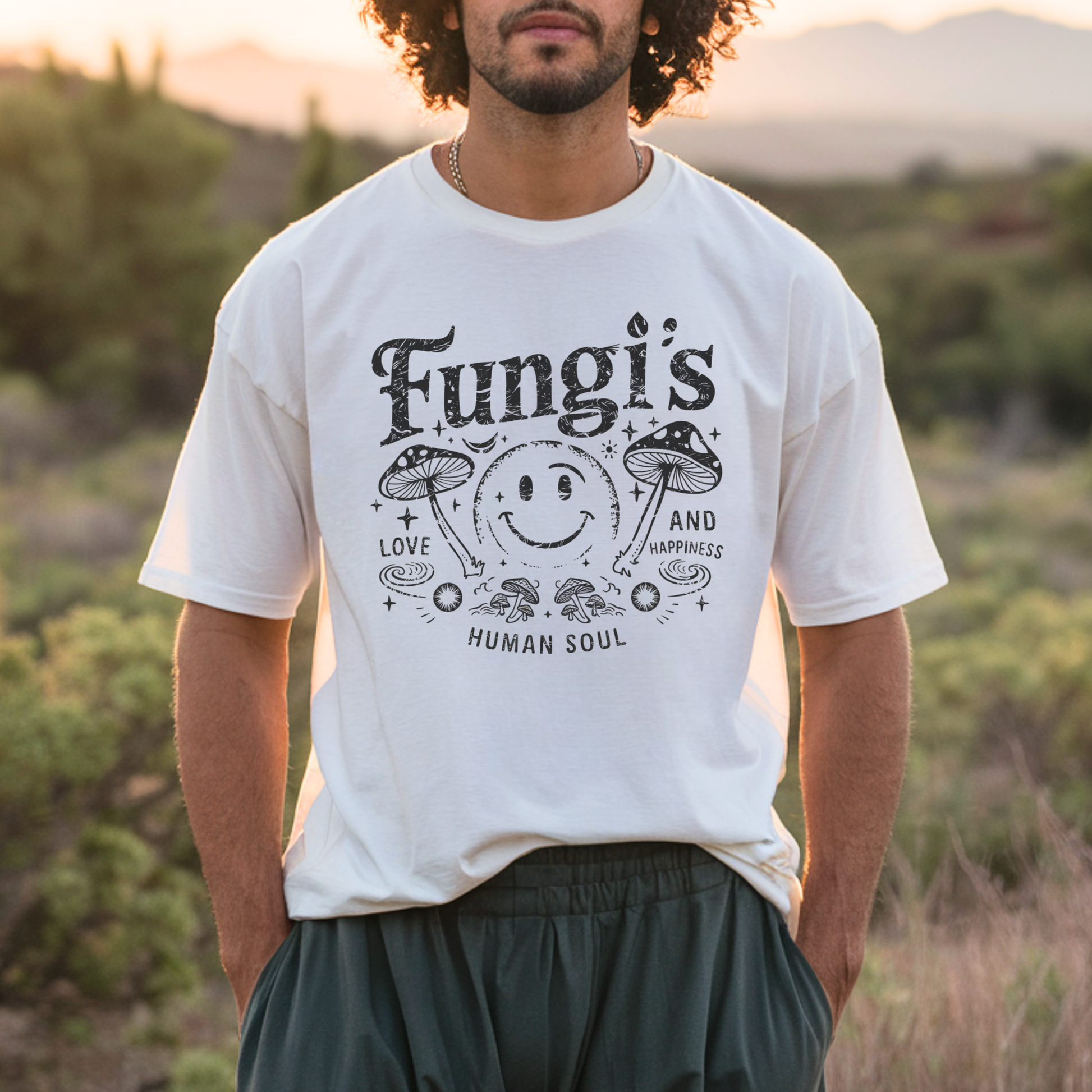 Channel the fungi vibes with our 'Fun Guys' magic mushroom t-shirt, featuring a smiley face, a magic mushroom, and celestial nature elements. Perfect for those who love to keep it playful and cosmic.