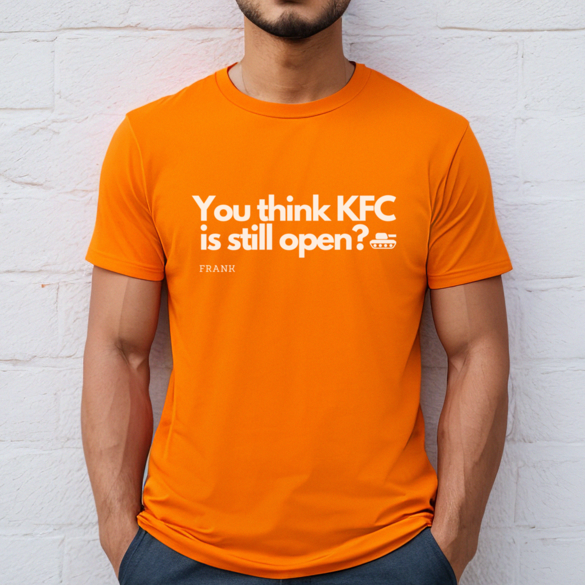 This T-Shirt features an old school movie quote, 'honey you think kfc is still open', with a nod to Frank the Tank. It gives off a retro and humorous vibe, perfect for movie lovers and fans of comedy classics. Ideal for casual wear or as a statement piece for social gatherings or movie nights. Relevant for birthdays, movie marathons, and casual hangouts.