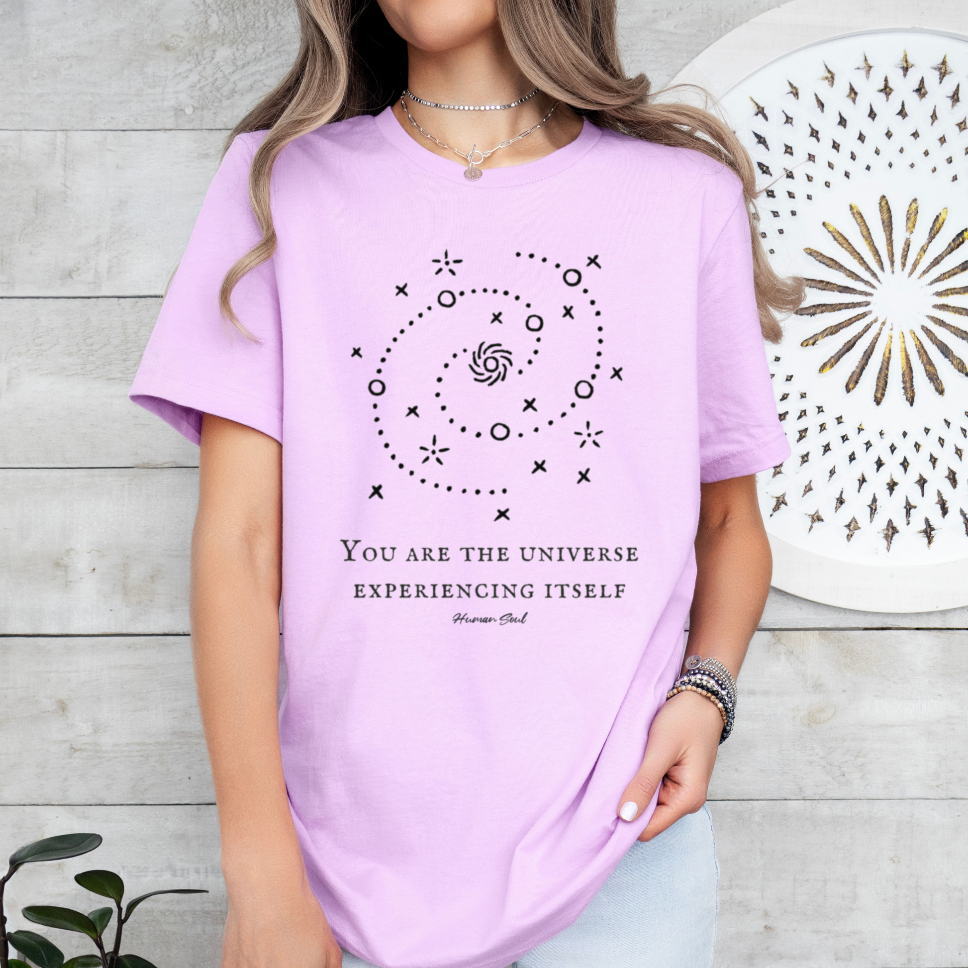 Embrace cosmic wisdom with our "You Are the Universe Experiencing Itself" spiritual awakening t-shirt, featuring a simple font and a cosmic design. Perfect for those who see the interconnectedness of all things.